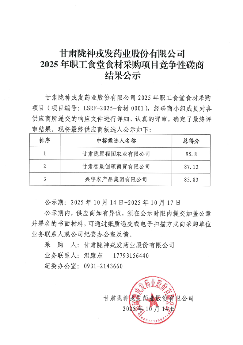 甘肅隴神戎發藥業股份有限公司2025年職工食堂食材采購項目競爭性磋商結果公示