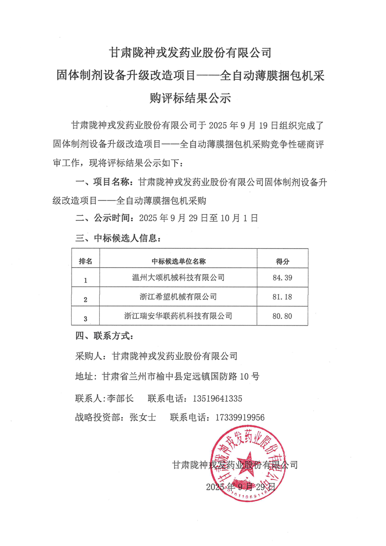 甘肅隴神戎發(fā)藥業(yè)股份有限公司固體制劑設(shè)備升級改造項目——全自動薄膜捆包機(jī)采購評標(biāo)結(jié)果公示